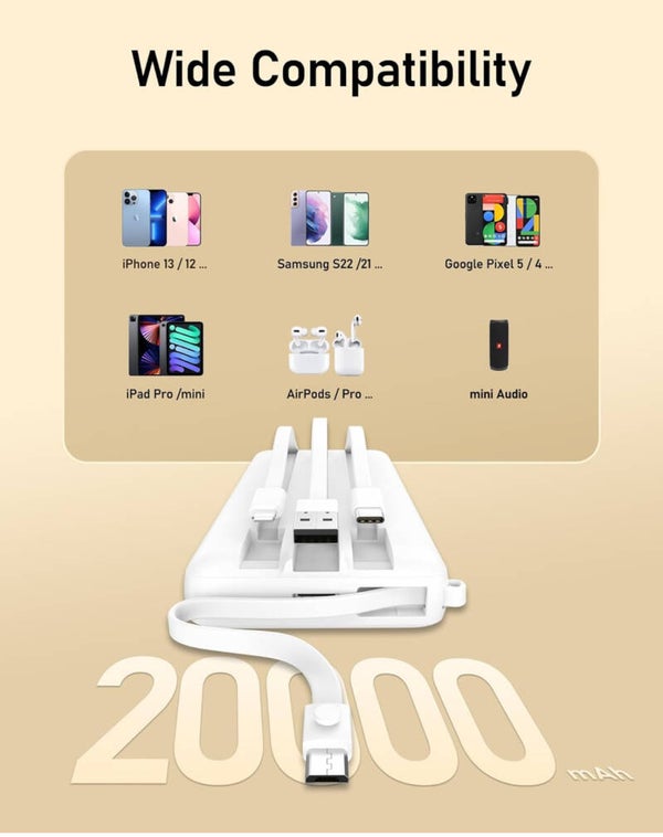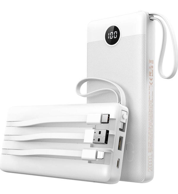 Power Bank with Built-in Cables, 20000mAh USB C Portable Charger with 5 Outputs